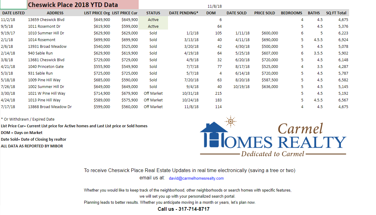 If you would like to have a more thorough discussion or review of home values; yours, the neighborhood’s or the surrounding neighborhoods, please contact Julie or me. As brokers, builders, and land developers here in Carmel (and Cheswick specifically) over the past twenty-plus years we bring a more insightful perspective for our clients. While it is our business, it is also our passion and as your neighbor, it is personal on several levels; we want you to understand the full value of your home to maximize the values of all our homes.
